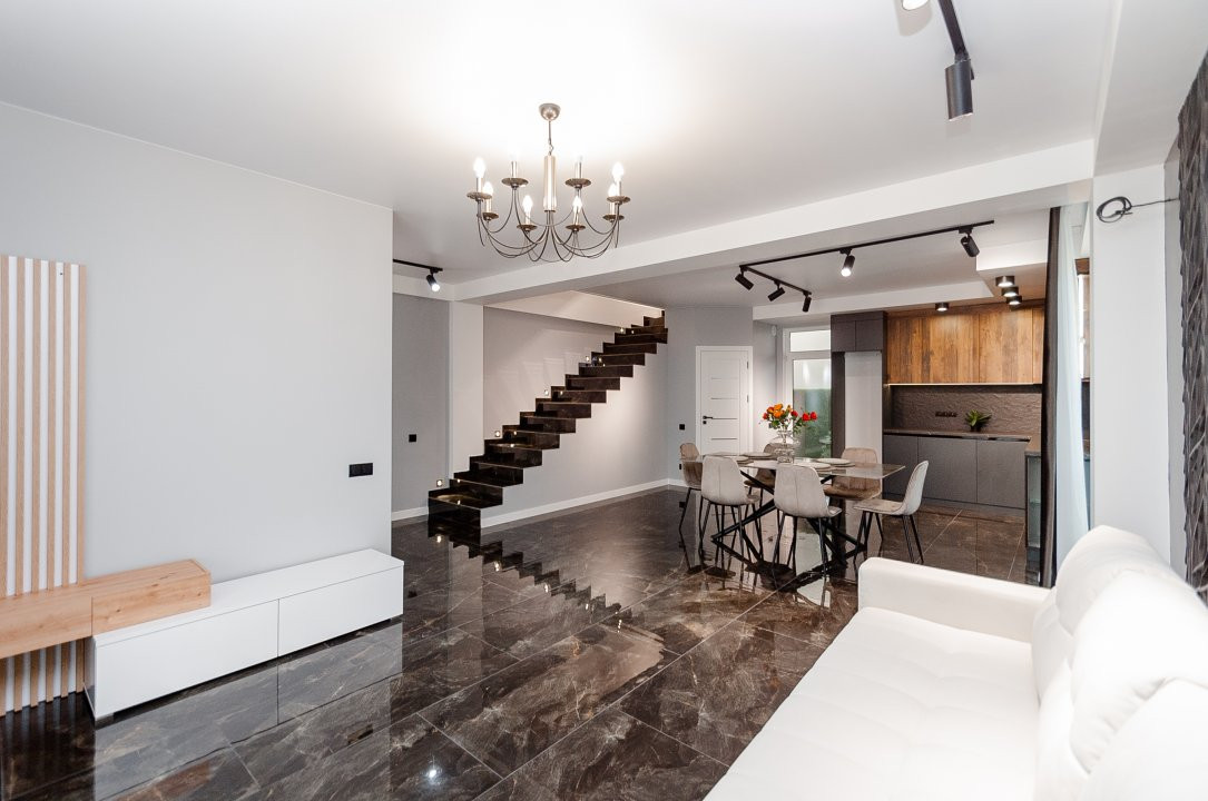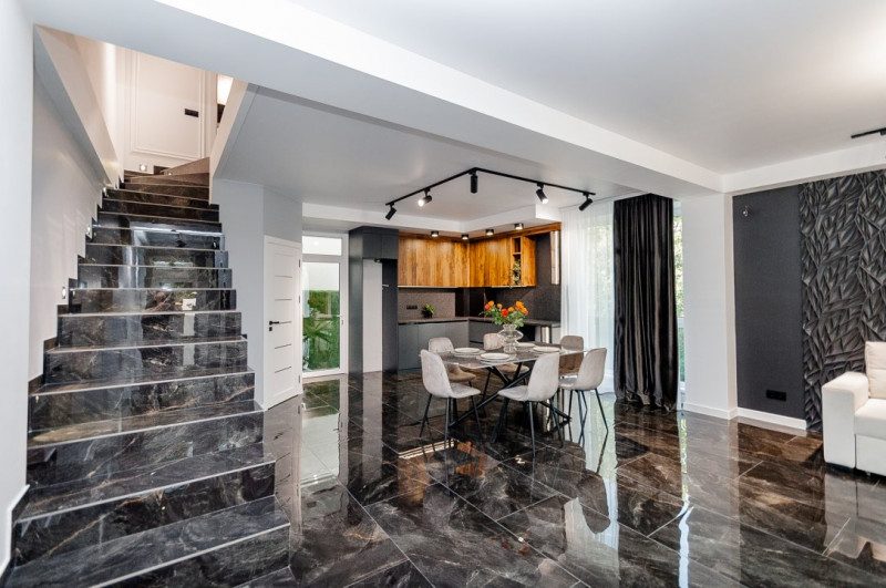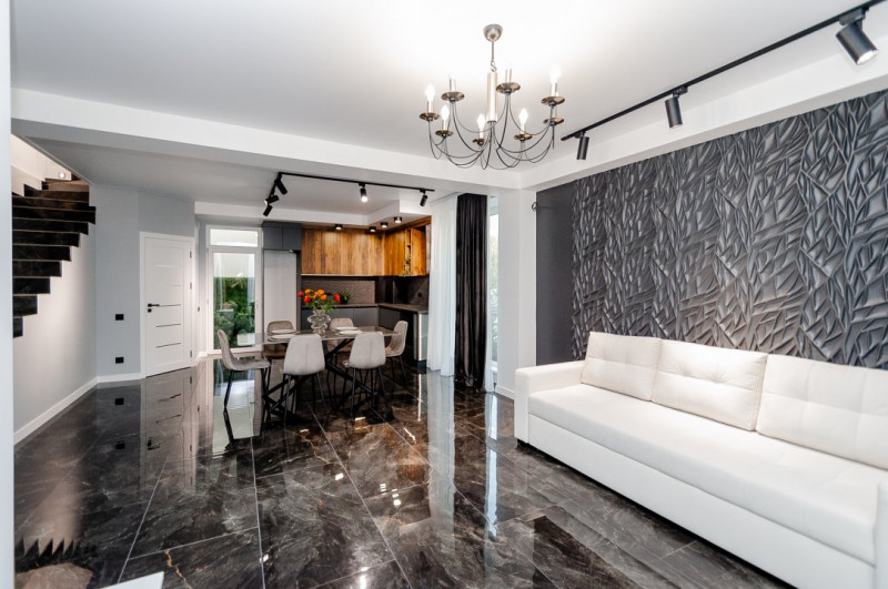 La parter, vă întâmpină un living generos și luminos, ideal pentru momentele petrecute alături de familie și prieteni, completat de o bucătărie deschisă și bine echipată.