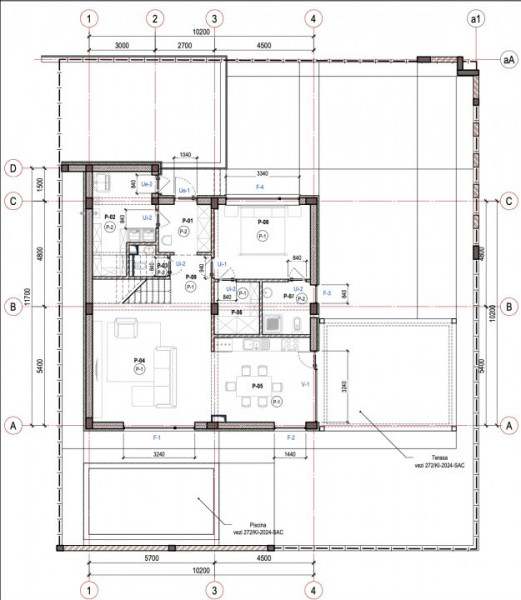Parter - antreu, încăpere tehnică, wc, living, bucătărie comasată cu sufragerie, garderobă, bloc sanitar, dormitor matrimonial, hol, terasă;