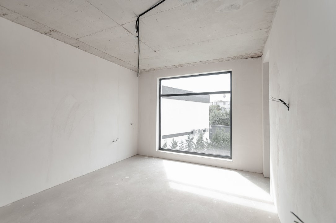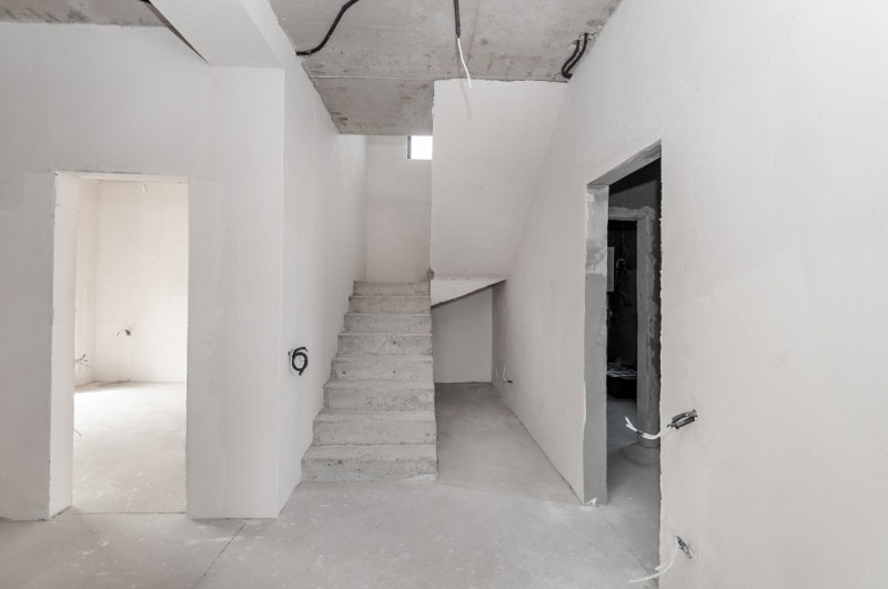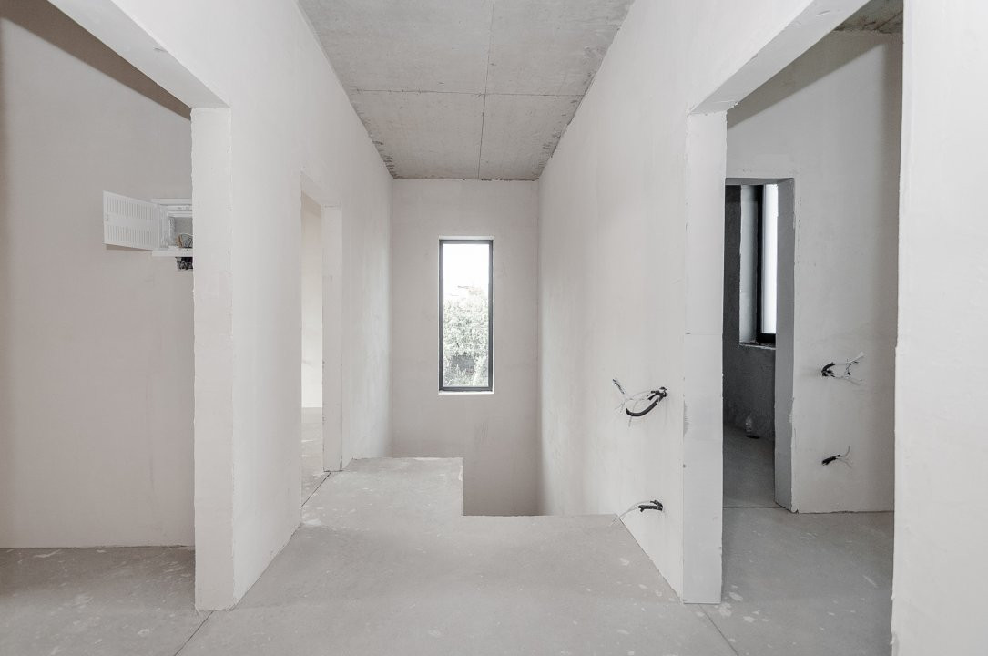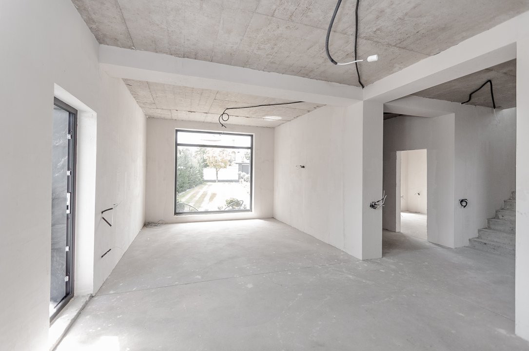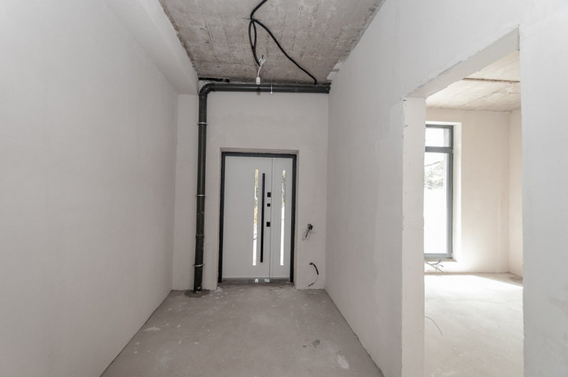 Imobilul este finisat la exterior, iar interiorul se află în varianta albă, ideală pentru a fi personalizată după preferințele noilor proprietari. Toate comunicațiile sunt deja conectate.