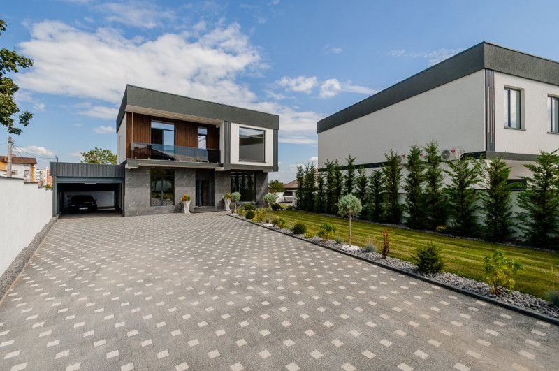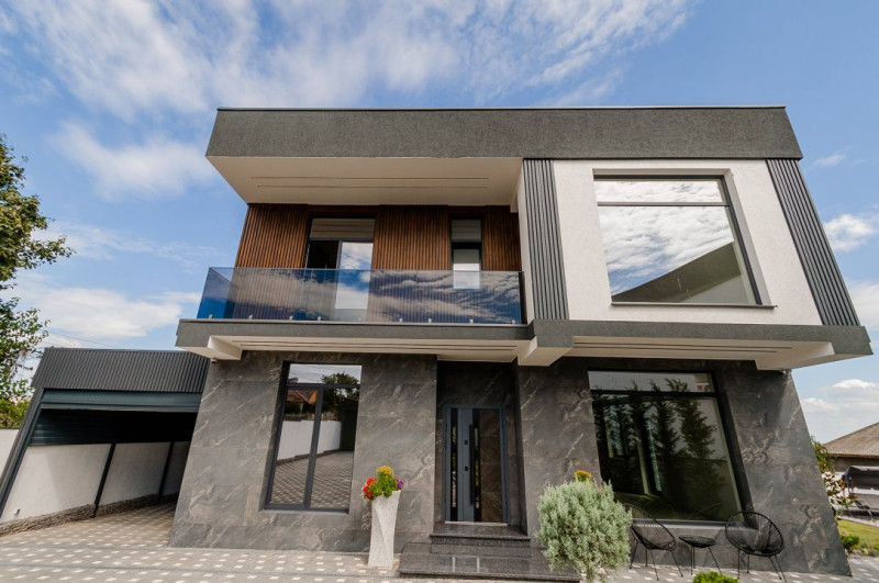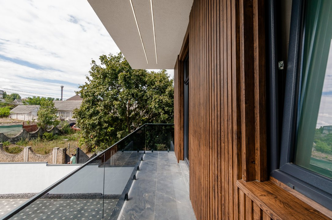 Etaj – 3 dormitoare, 2 băi, 2 garderobe, o terasă spațioasă accesibilă din 2 dormitoare și un balcon suplimentar.