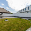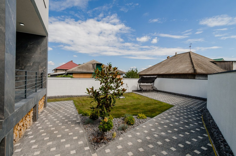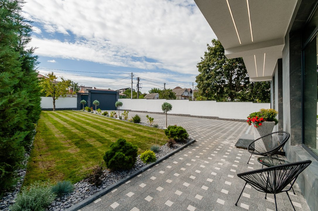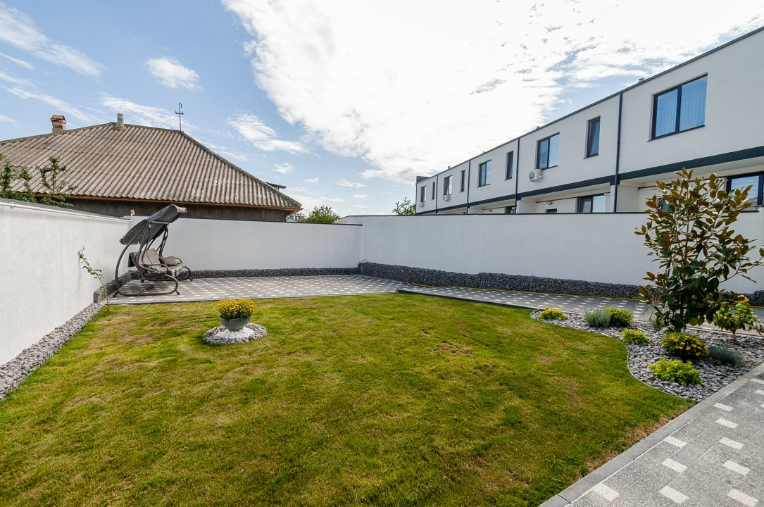 Curte amenajată cu gazon verde și pomi decorativi, perfectă pentru relaxare.