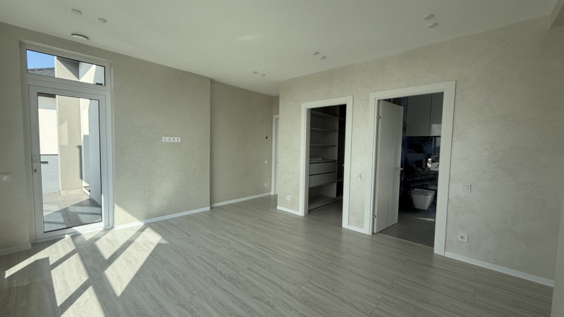 Dormitor matrimonial cu bloc sanitar propriu și garderobă.