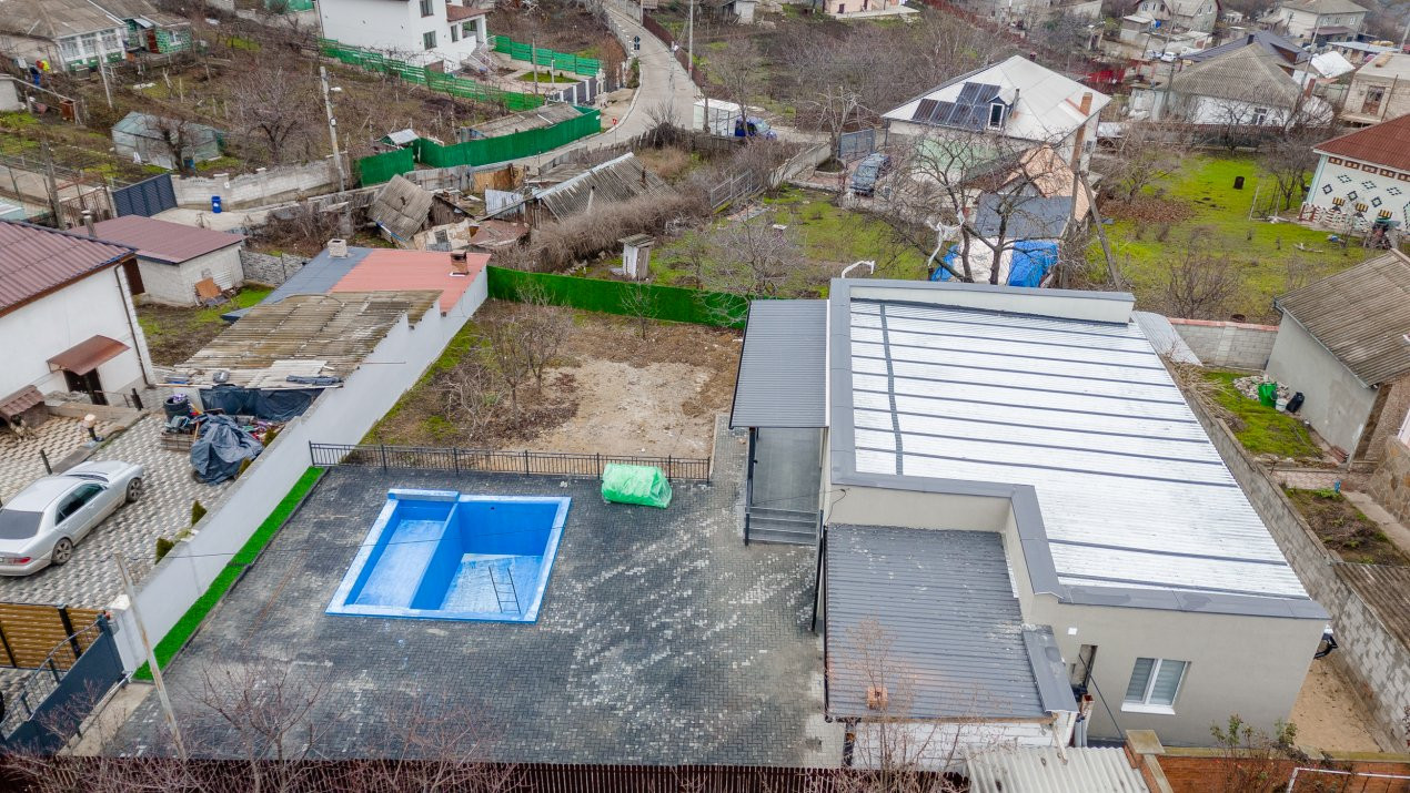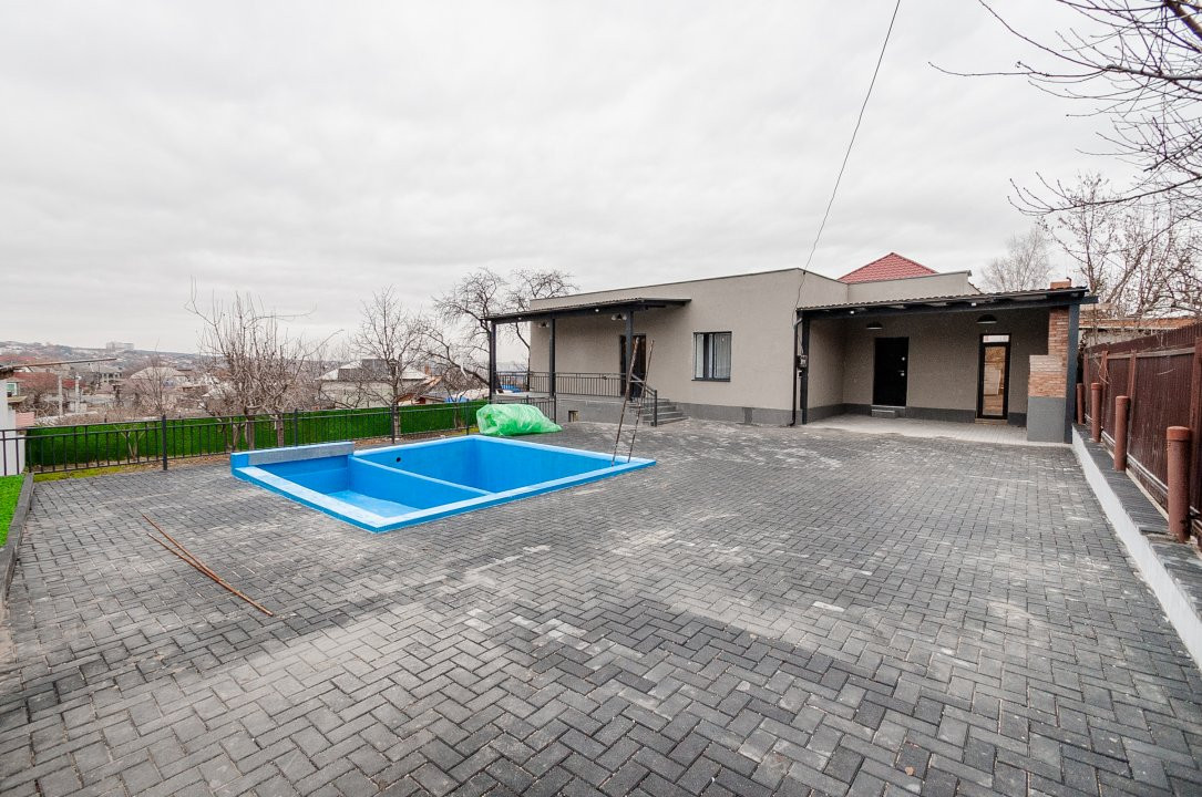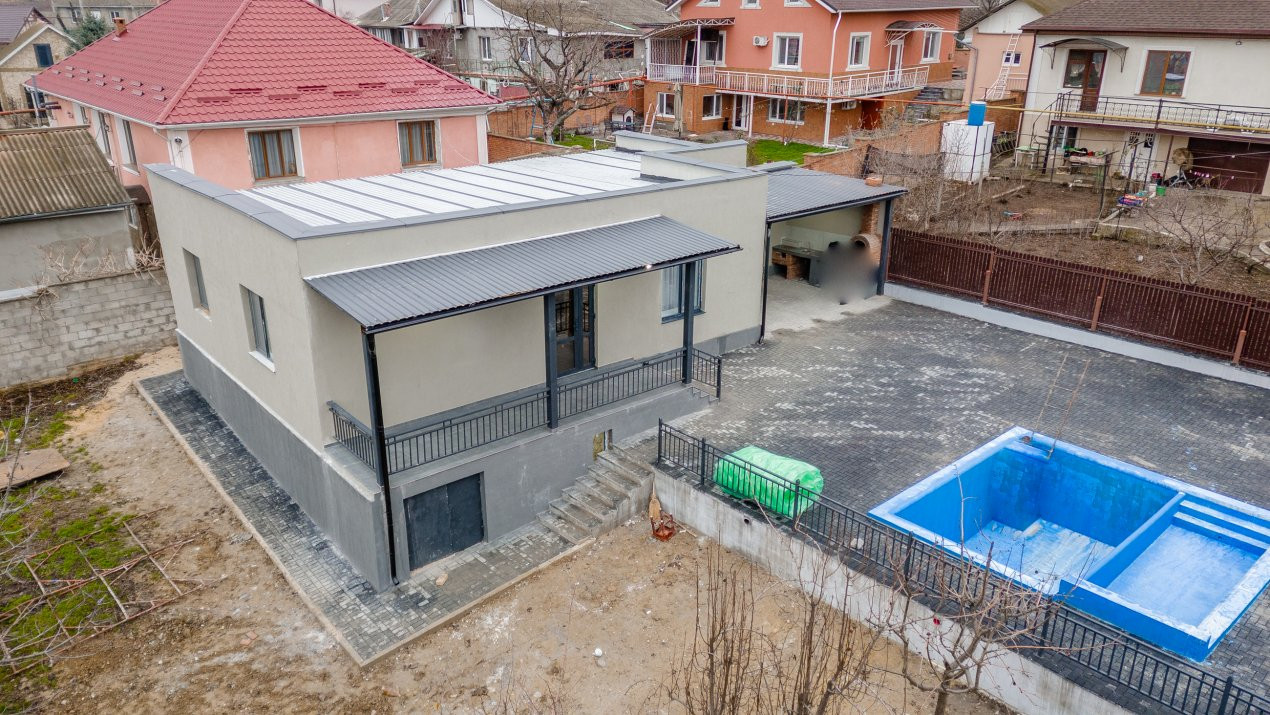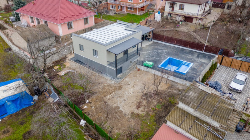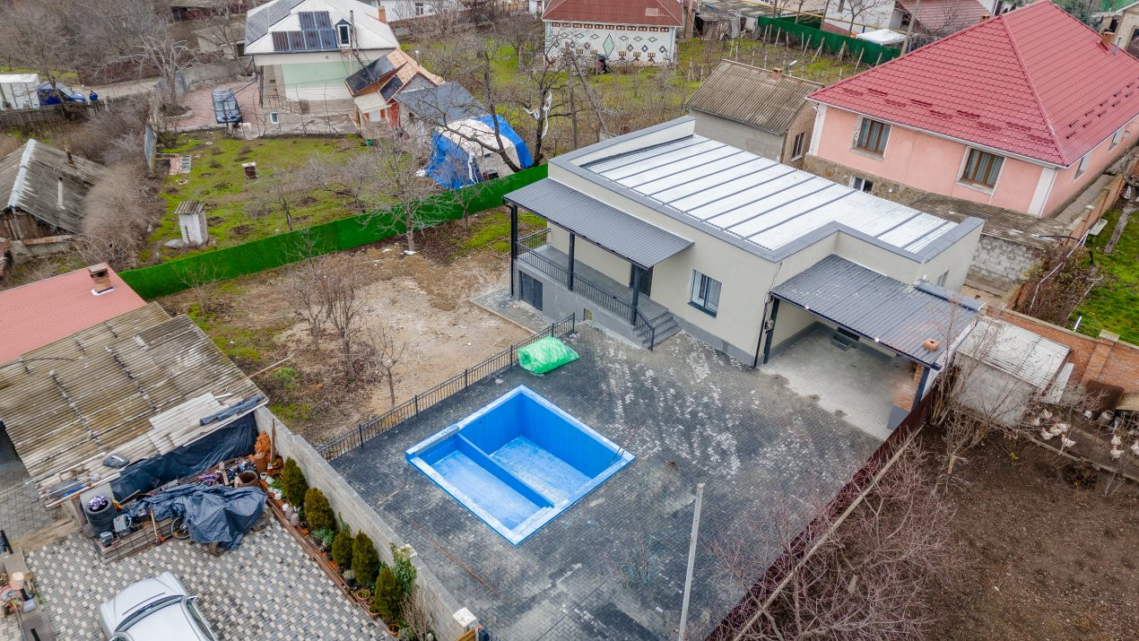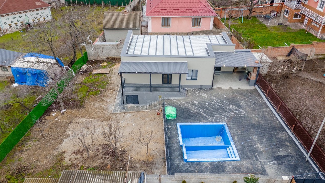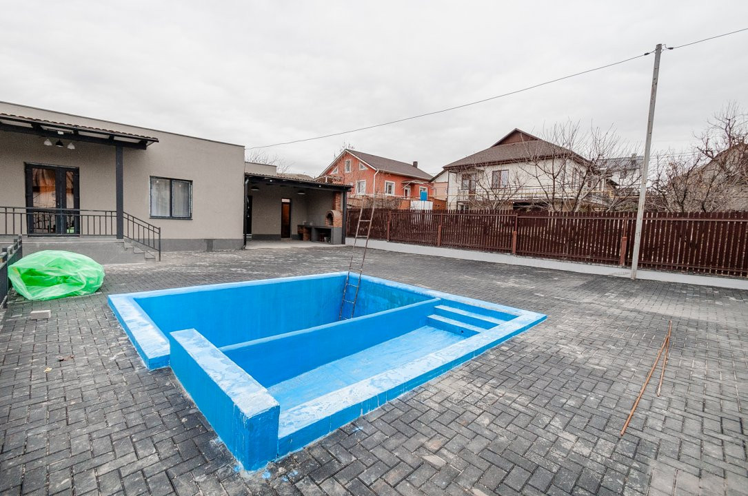 Casa este amplasată pe un teren generos de 7 ari, dispune de piscină, ideală pentru relaxare și timp liber.