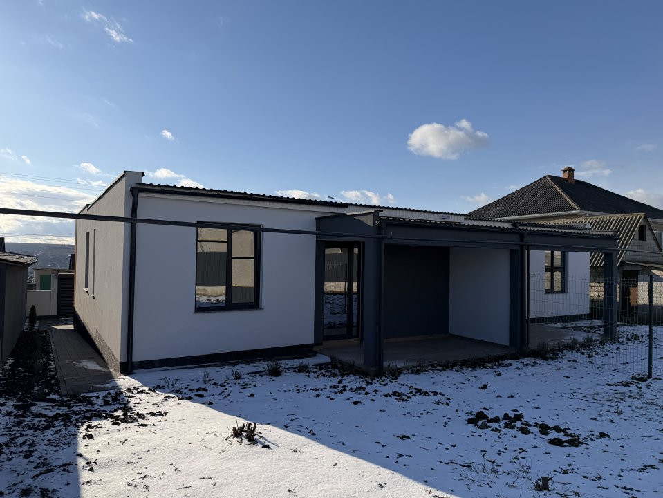 Locuința dispune de geamuri panoramice, care asigură lumină naturală din plin și creează un ambient luminos și aerisit.