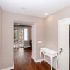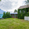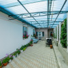 Curtea casei este pavată și amenajată cu copaci decorativi.