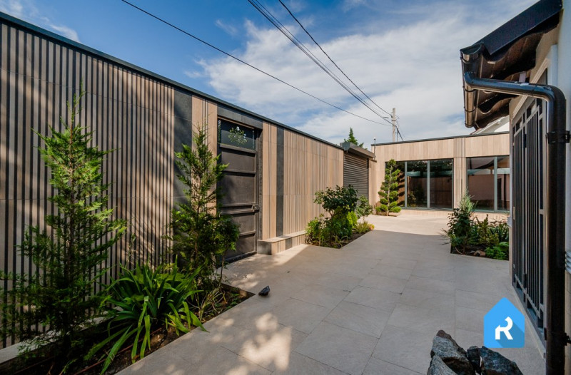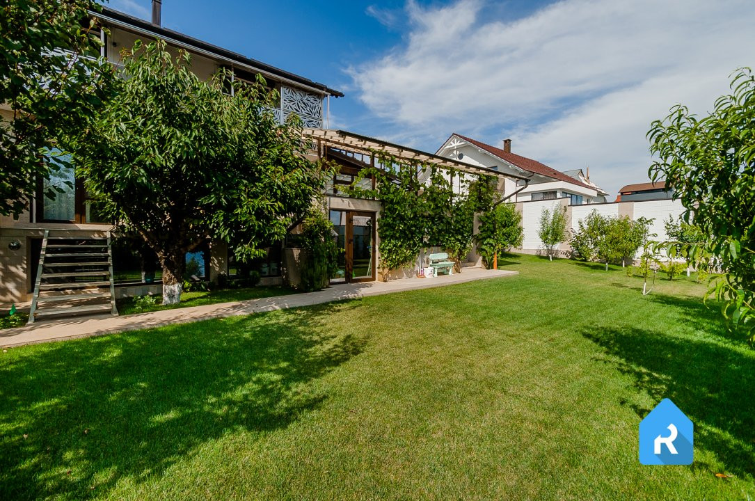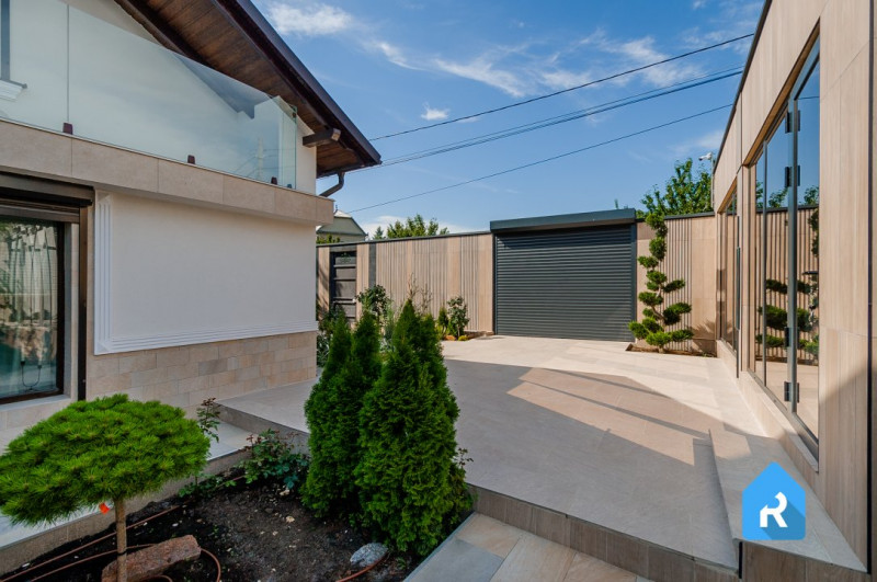 Terenul are o suprafață de 8,65 ari, amenajat cu gazon îngrijit, pomi fructiferi și sistem de irigare automată.