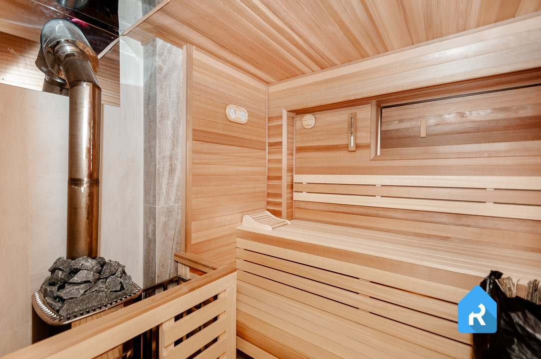 Nivelul 1: bucătărie cu living spațios și ieșire spre terasă, saună, cameră pentru oaspeți, două blocuri sanitare.