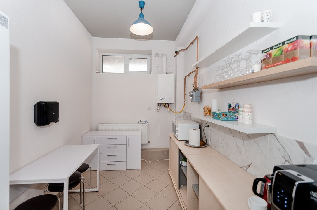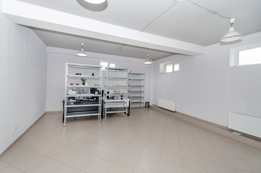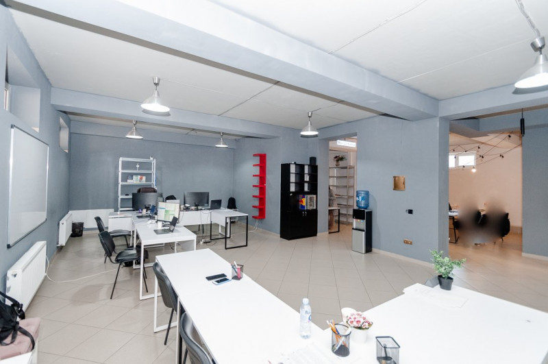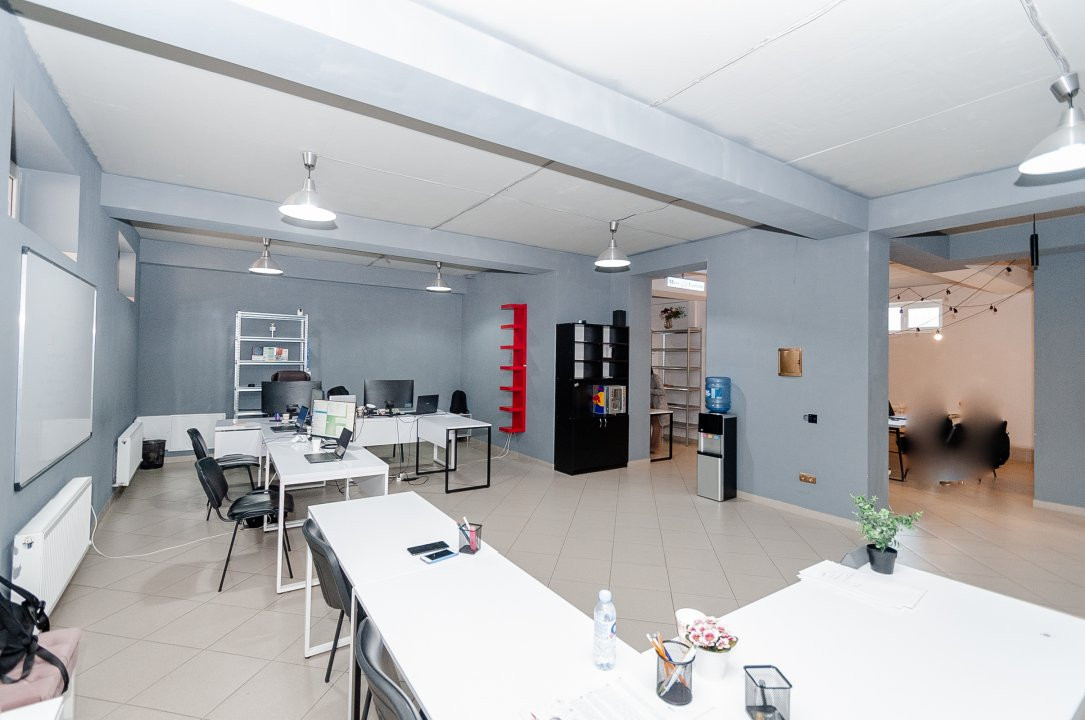 Suprafața totală de 176 mp este eficient compartimentată în 4 zone de lucru, o bucătărie, un grup sanitar, un depozit.